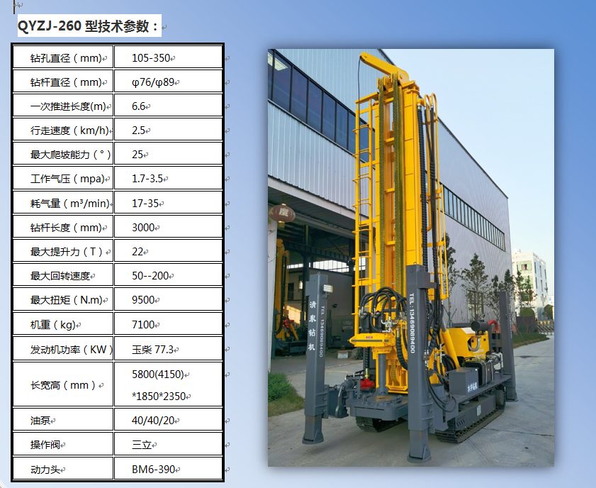 清泉260型潛孔水井鉆機(jī) 發(fā)動(dòng)機(jī)功率:玉柴77.3千瓦。 油泵:泊姆克三聯(lián)泵。 動(dòng)力頭馬達(dá): BM6-390。 最大扭矩: 9500 扭米。 最大提升力: 22噸。 操作閥:三立。 整機(jī)機(jī)重: 7.1 噸。 尺寸:長5.8米(底長4. 15米),寬1.85米,高2. 35米。 鉆孔直徑: 105-350 毫米。 鉆桿直徑: φ 76/φ89毫米(3米)。 一次性推進(jìn)長度: 6600 毫米。